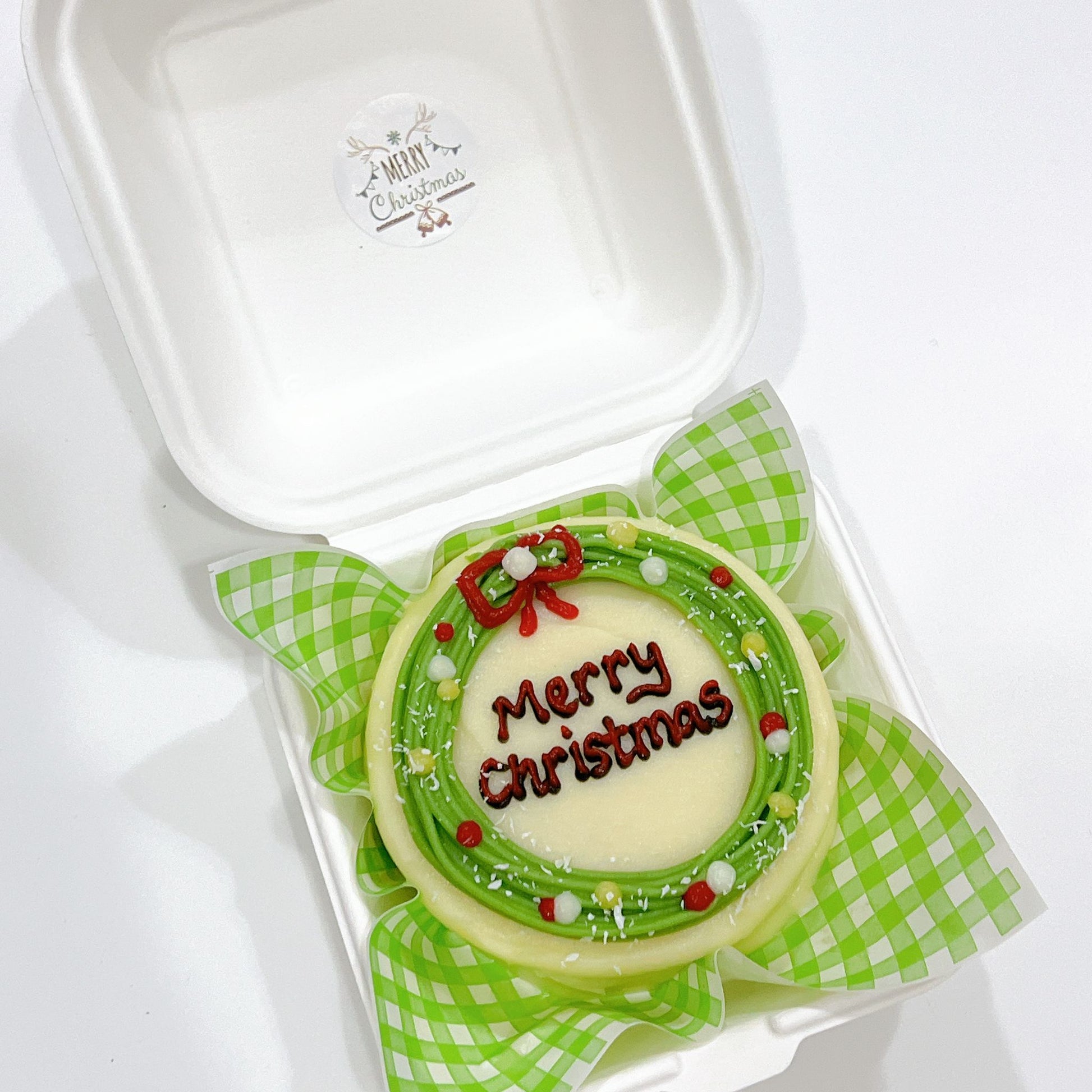This cake is frosting with potato cream, Christmas wreath piping and Merry Christmas wording. Pack with bento box.